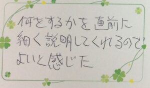 丁寧に説明頂き何をされているか分かりながらだったので安心致しました。