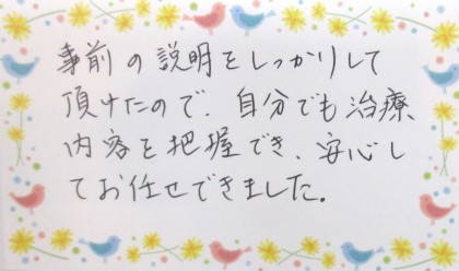 事前の説明をしっかりして頂けたので自分でも治療内容を把握でき、安心してお任せできました。