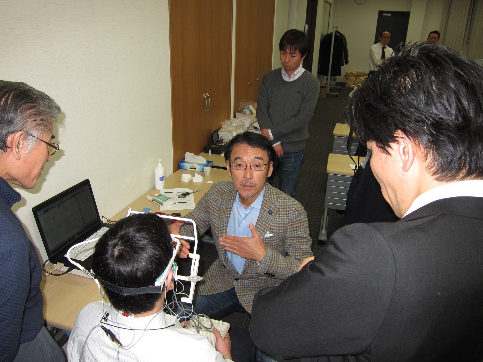 コースは、かみ合わせの筋肉が最もリラックスできる顎の位置を基準に、K7という咬合の検査用コンピュータを使って診断する方法を講義したり、参加者同士でお互いに筋電図の電極を貼りあって、検査しあったりします。