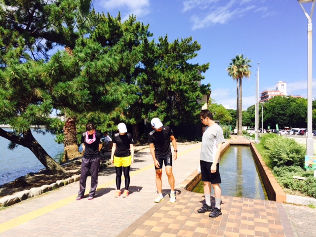 入部にあたって、オーナーの私からランニングについての座学(ランニングの意義、怪我をしない正しい走り方、食事と運動、大会へ向けての準備など)を行った後、大濠公園で実際に走り方の指導と練習を行いました。