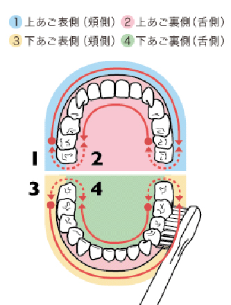 磨く時は、洗面の鏡の前で自分の顔と歯を見ながら磨くようにしましょう