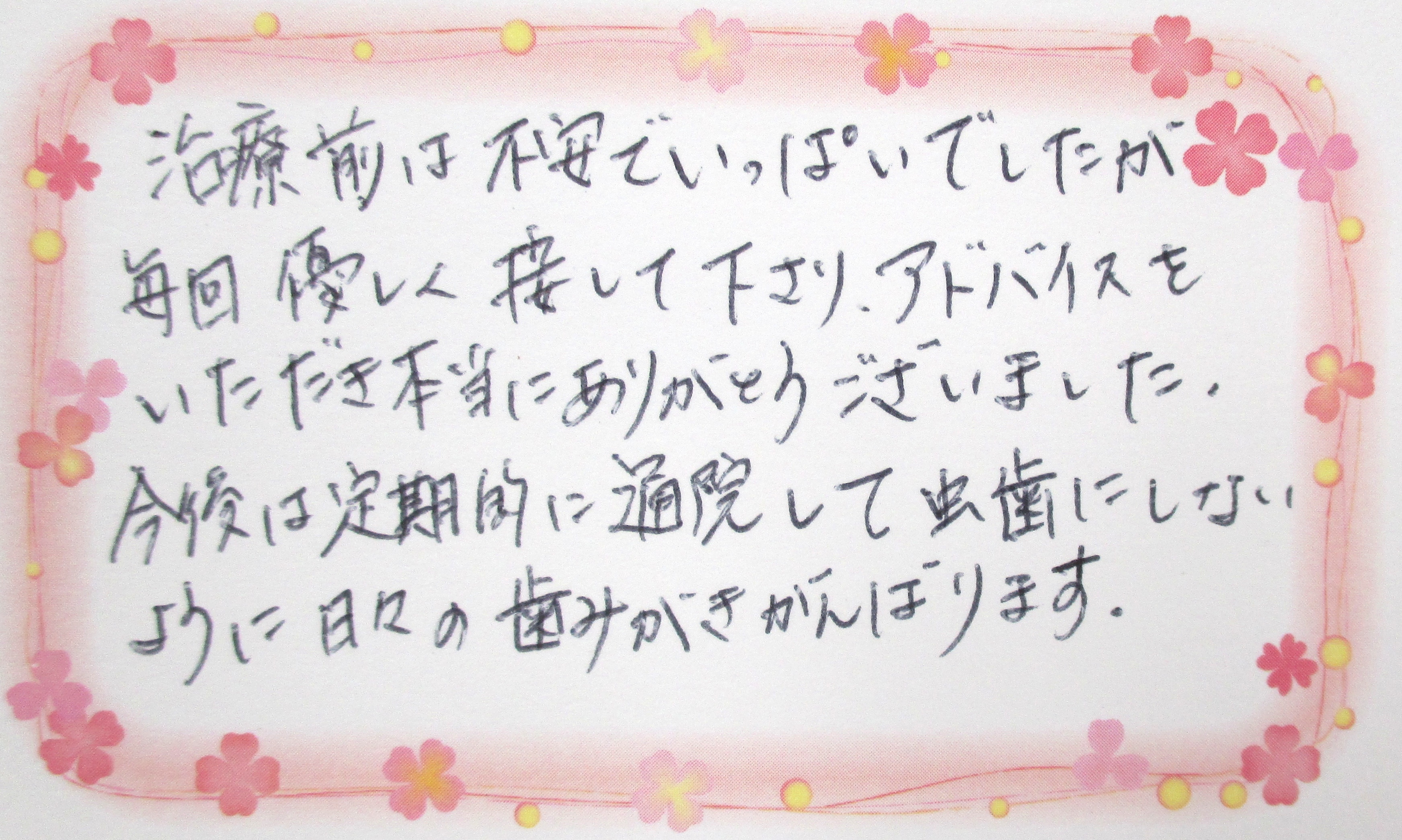 治療前は不安でいっぱいでしたが、毎回優しく接してくださり、アドバイスをいただき本当にありがとうございました。
