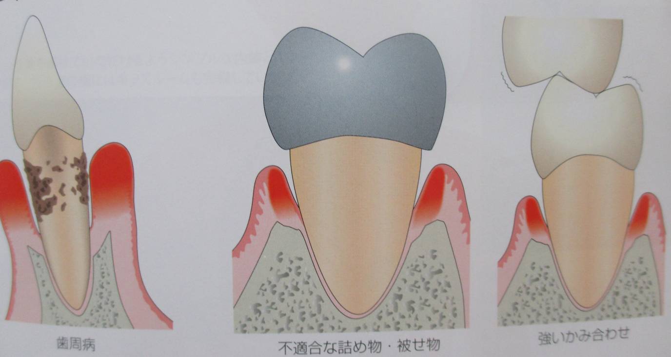 お口の中では、歯石や、適合の悪い詰め物や被せ物、強すぎる咬みあわせなどがあります。