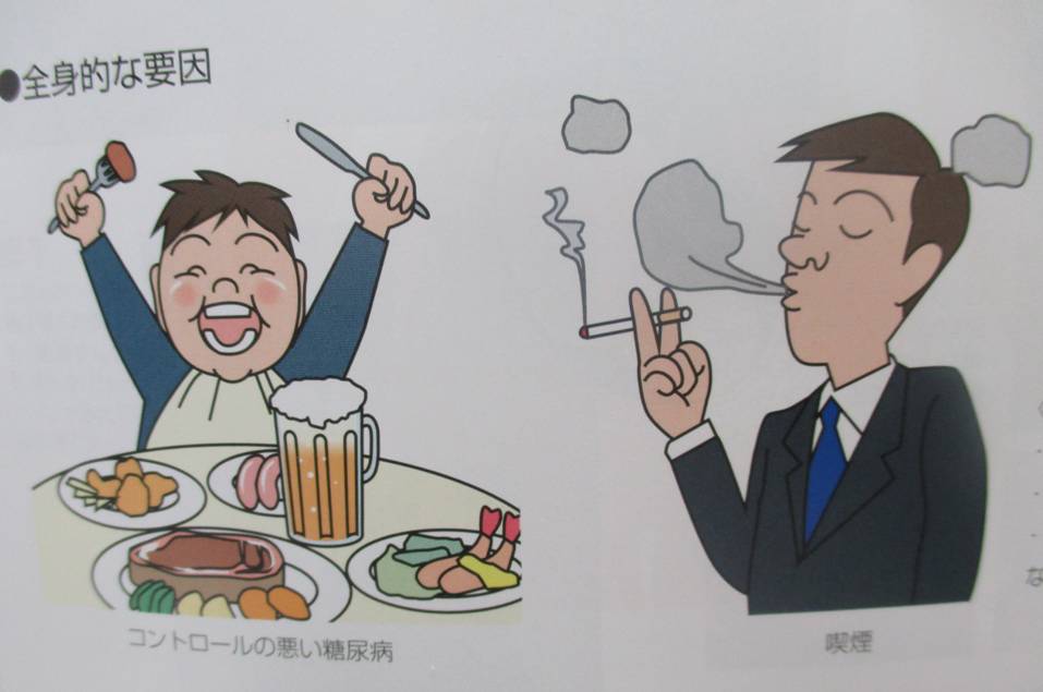 全身的な要因としては、喫煙習慣や糖尿病、骨粗しょう症などの全身疾患、ストレス、肥満など沢山のものがあります。