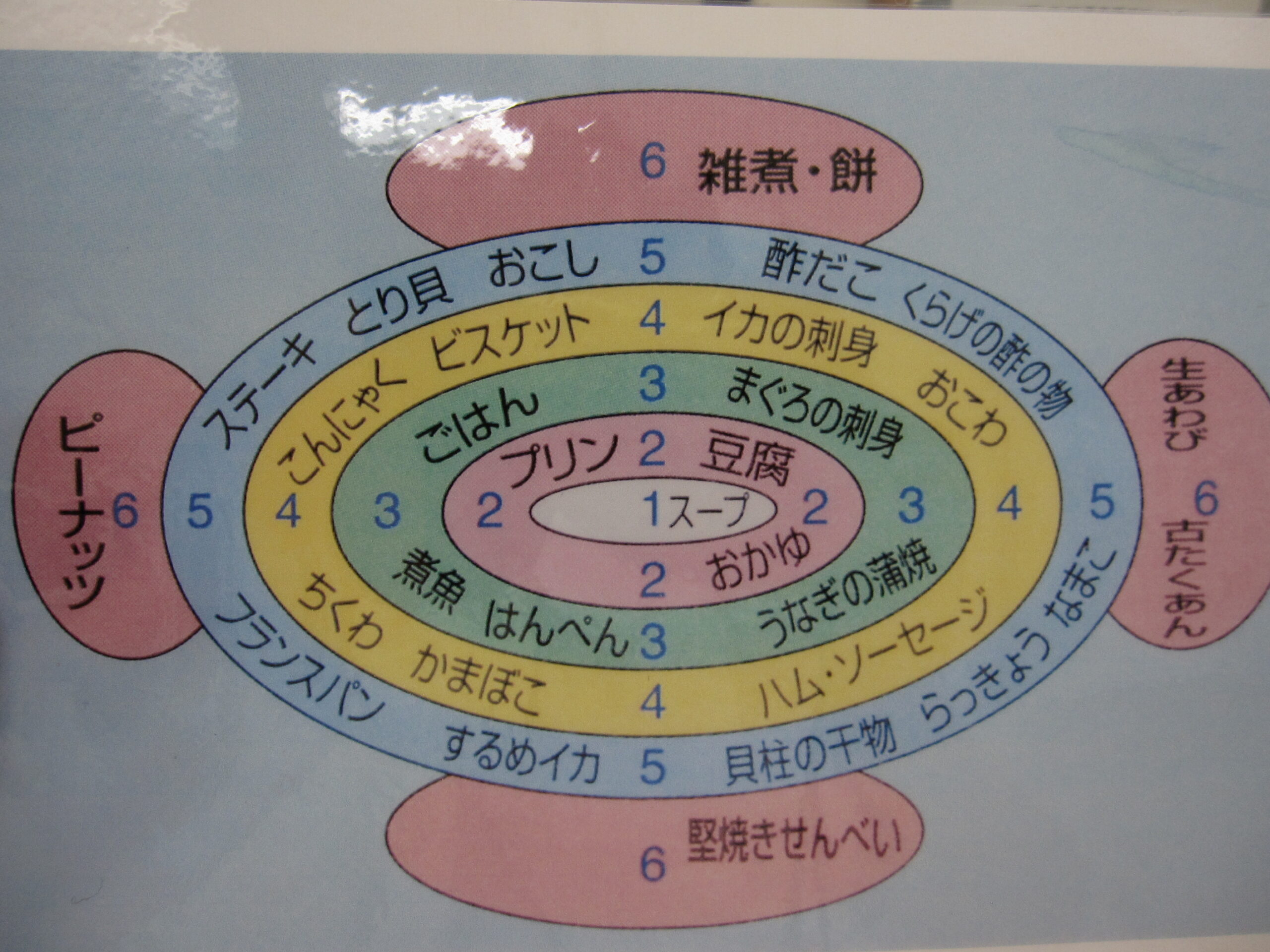 食品の固さを区別する見本表です。数字が小さいほど柔らかい食品です。