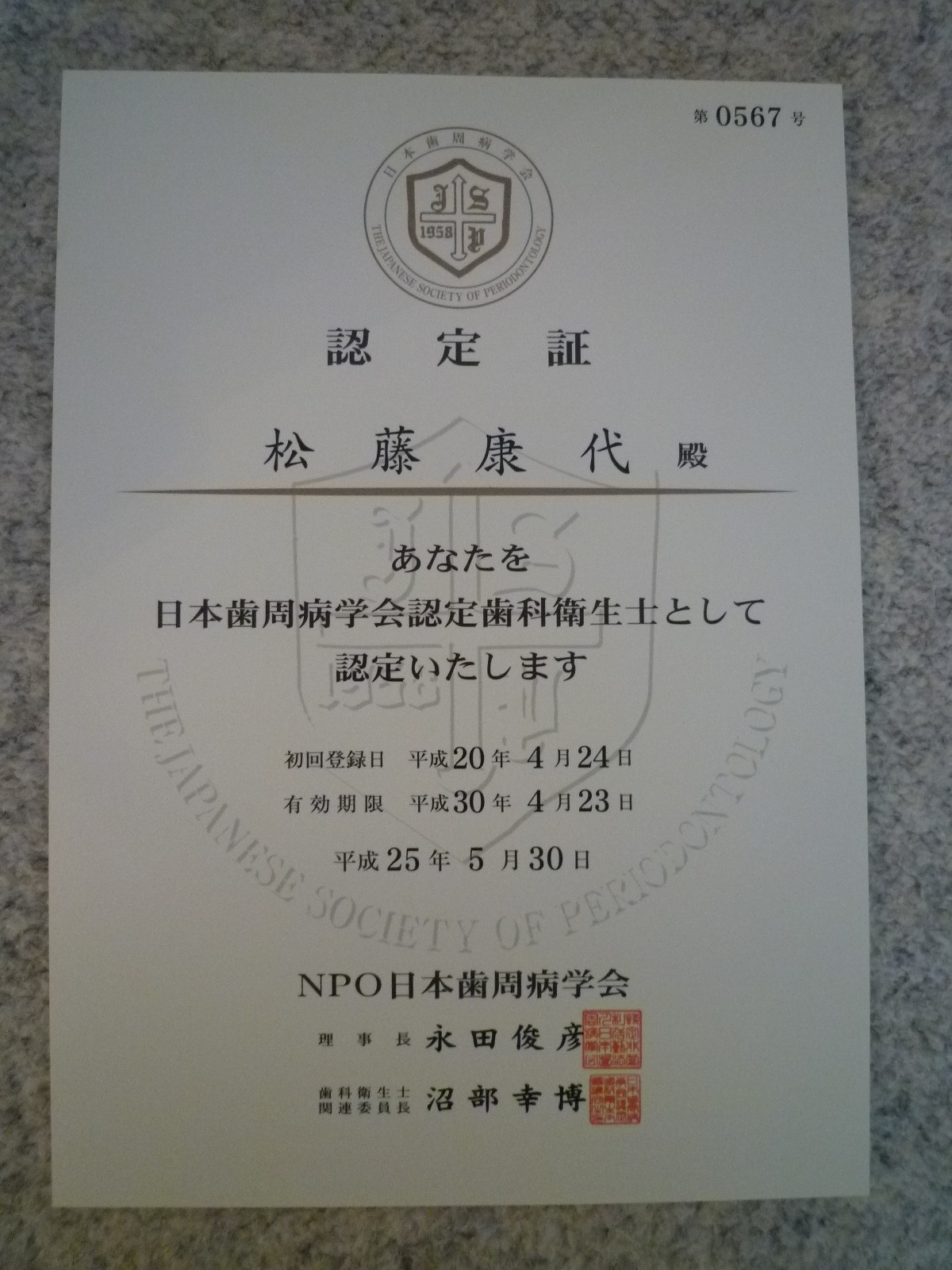 先日、歯周病学会より更新に合格したとの認定書が届きました。