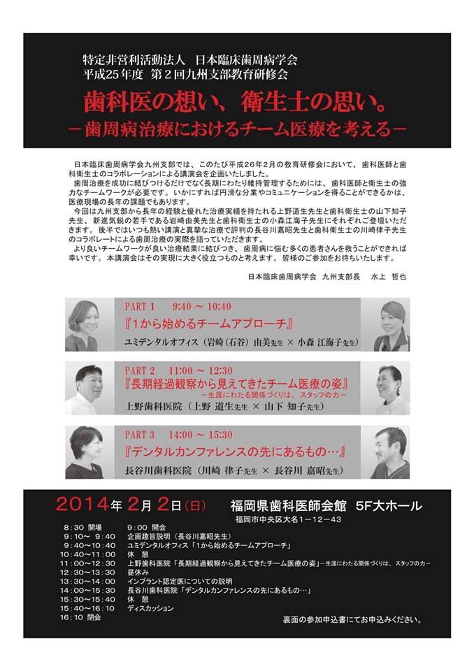 それぞれの医院が歯周治療を成功に結びつけるだけでなく、長期にわたり維持管理するための歯科医師と衛生士のチームワークについての内容でした。