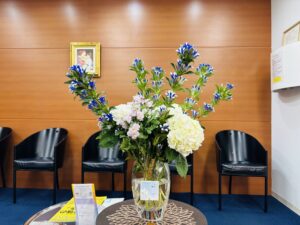 今週のお花は 季節外れですが白くて綺麗なアジサイ、ストック、リンドウです。